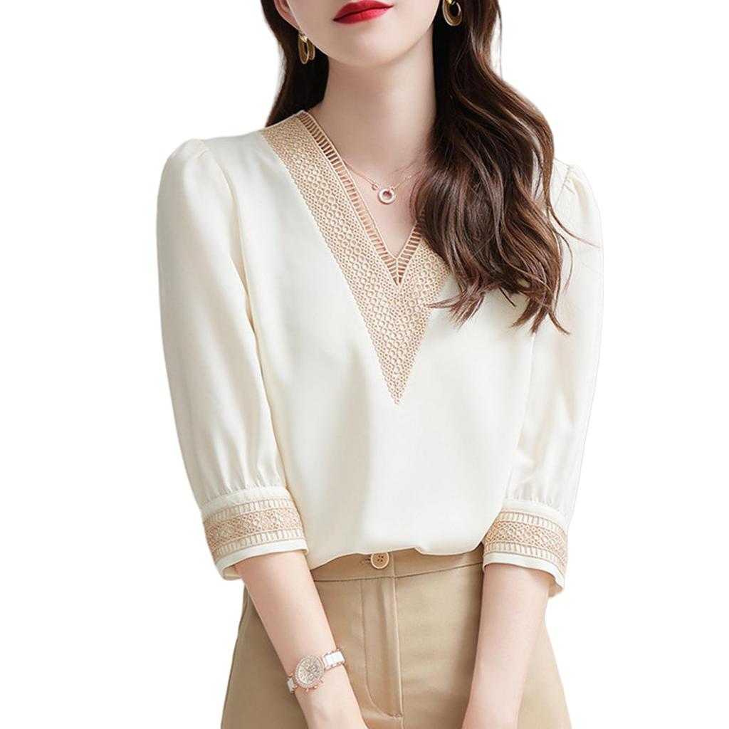 [Elegant short-sleeved blouse for women] A blouse that will bring out the feminine charm of an adult with just one piece! The ethnic embroidery design on the collar and cuffs is a stylish point, adding an elegant atmosphere to the blouse. The slightly wide V-neck design shows off the collarbone, and every time you move, your feminine charm will shine along the neckline. A fashionable women's blouse that will make you look feminine just by wearing it.