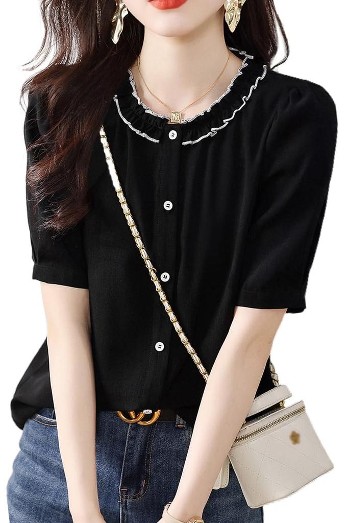 Blouse Summer Tops Short Sleeve Crew Neck Shirt Frill Collar Button Front Opening Top Stylish Feminine Clean Adult Casual OL Commuting [H. Zroy]
