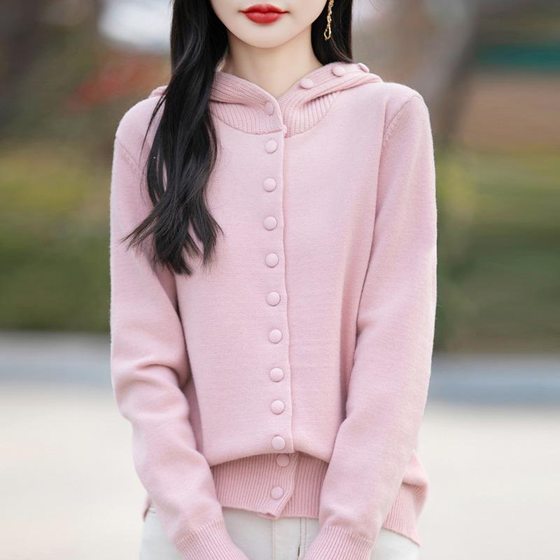 Spring New Hooded Knitted Cardigan with Buttons, Solid Color Loose and Versatile Top Coat