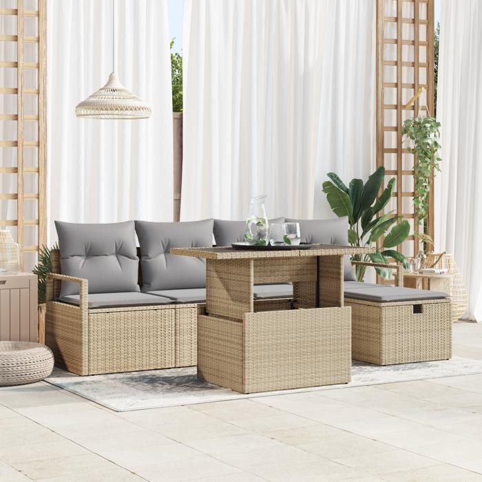 Ensemble de 6 pièces de canapés de jardin avec coussins beige poly rotin, Canapé de jardin 2 places avec rangement 3361119