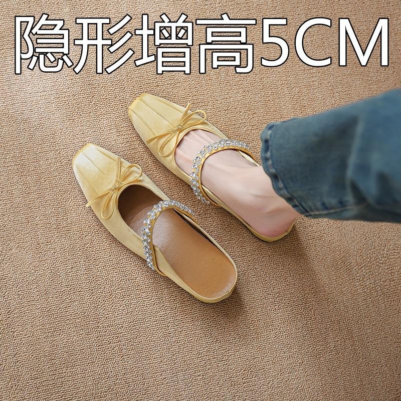 Silk Rhinestone Bow Square Head Heightening Bag Head Half Slippers Women Wear New Thick Heel Cool Slippers