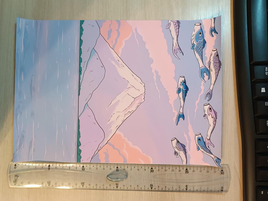 The poster arrived in about a month and a half. It's small, the print is clear, and it's on a fabric base.