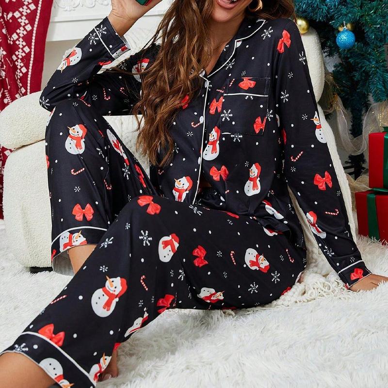 Autumn Winter Pajamas Set Women's Christmas New Year Cute Cartoon Pyjamas Two-piece Set Casual Loungewear Black Sleepwear
