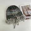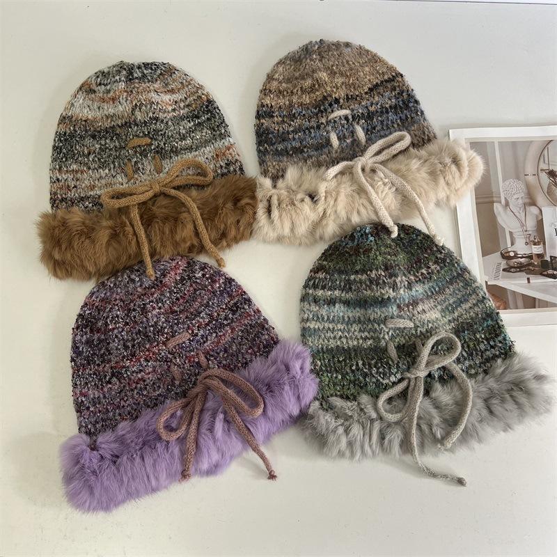 Niche Mixed-color Rabbit Rough Edge Warm Big Head Circumference Knitted Hat Women's New Autumn and Winter Design Sense Strap Headgear