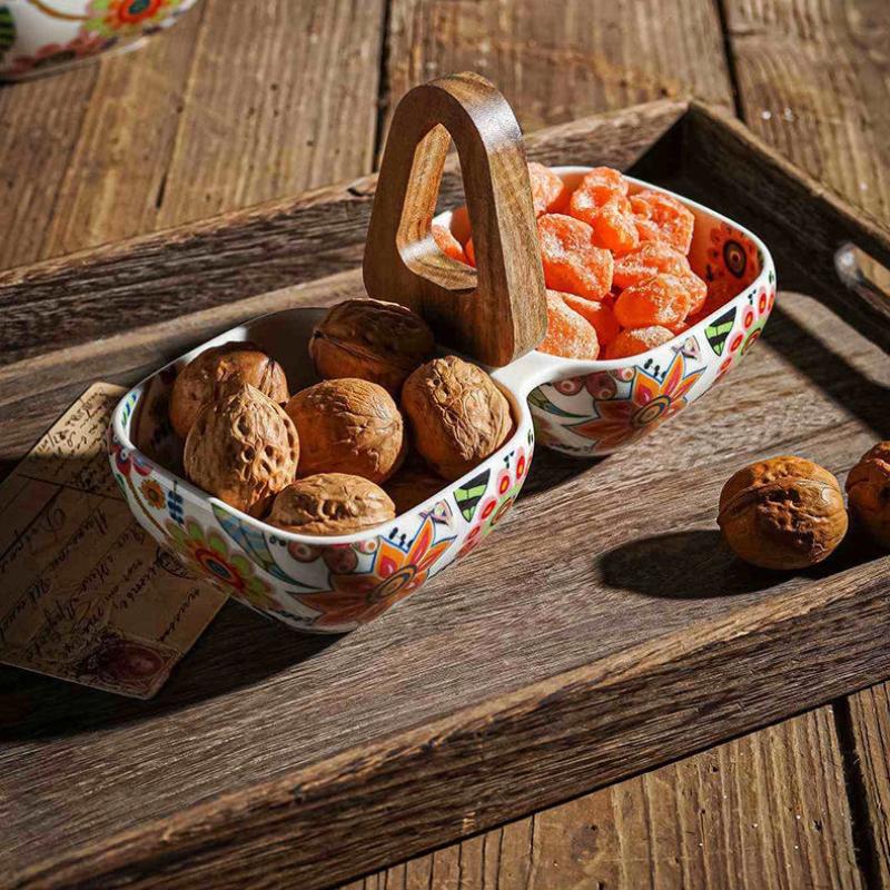 Creative Double Ceramic Fruit Bowl with Handle – Floral Design Snack Serving Tray