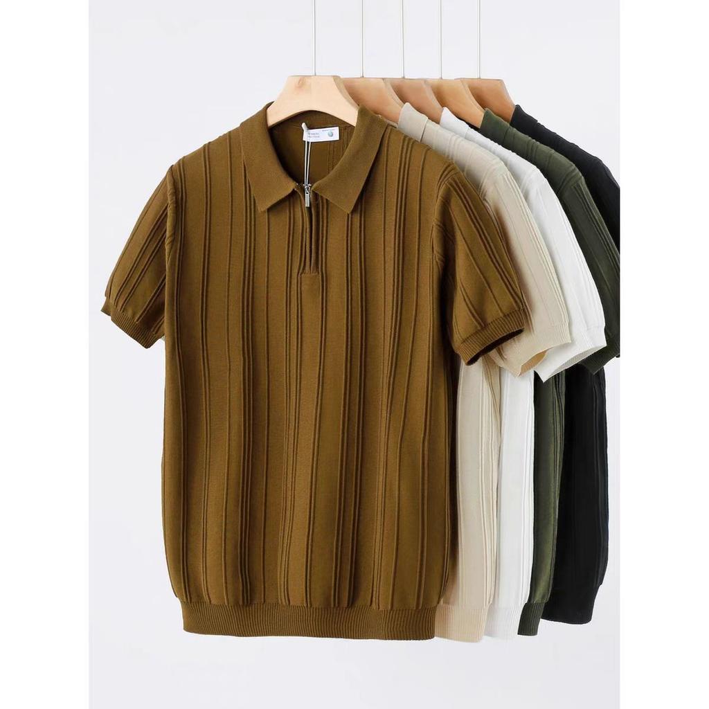 Half-Zip Knitted Short Sleeve Men's Thin Sweater T-Shirt 2025 Summer New Ice Silk Turn-Down Collar Half Sleeve