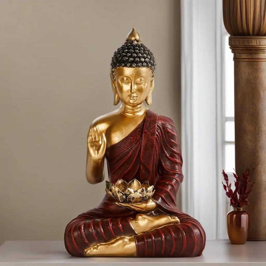 Meditating Sitting Buddha Statue Showpiece Idol Home Decor Living Room Gifts Decorative Showpiece - 27 Cm (Resin, Red, Gold)
