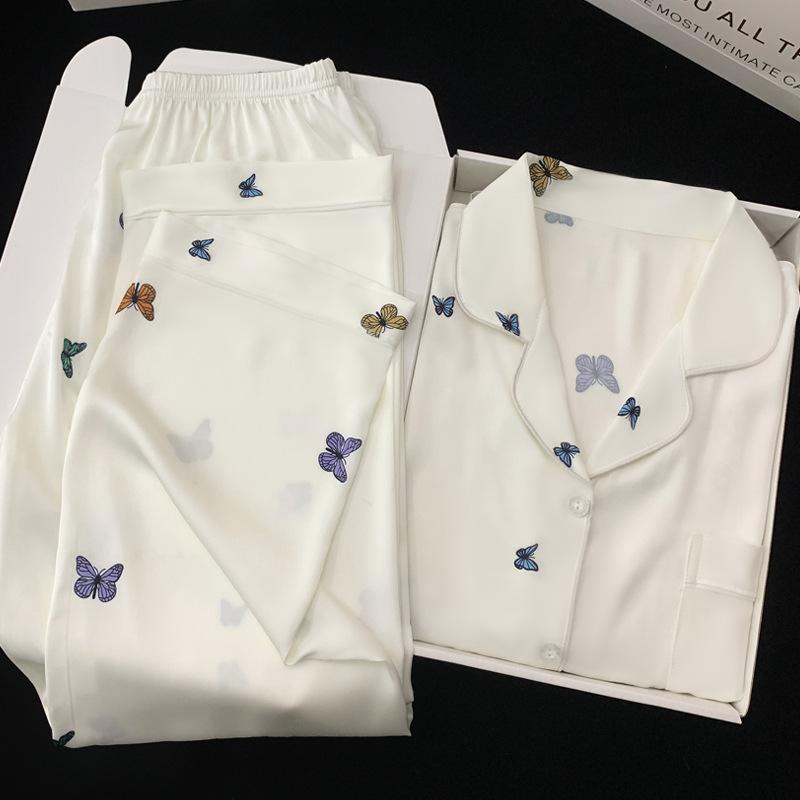 High-Quality Fashion Pajamas Women'S Autumn Long-Sleeved Suit Ice Silk Butterfly Printing Casual Loungewear Real Shot