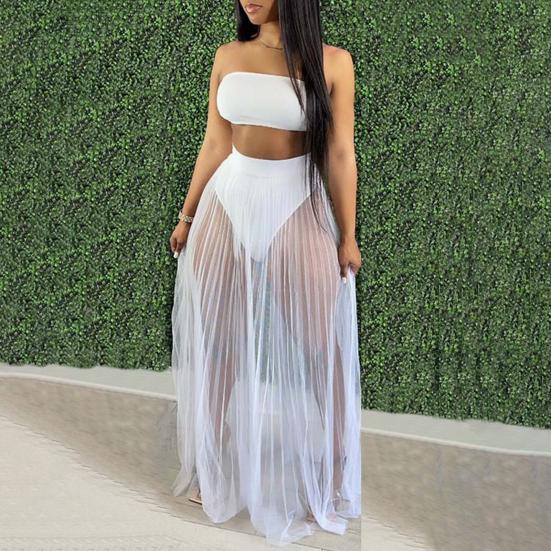 The set includes a sleek vest paired with a mesh pleated long skirt, exuding elegance and allure. The solid color design is effortlessly sophisticated, with a form-fitting top and a flirtatious bottom.