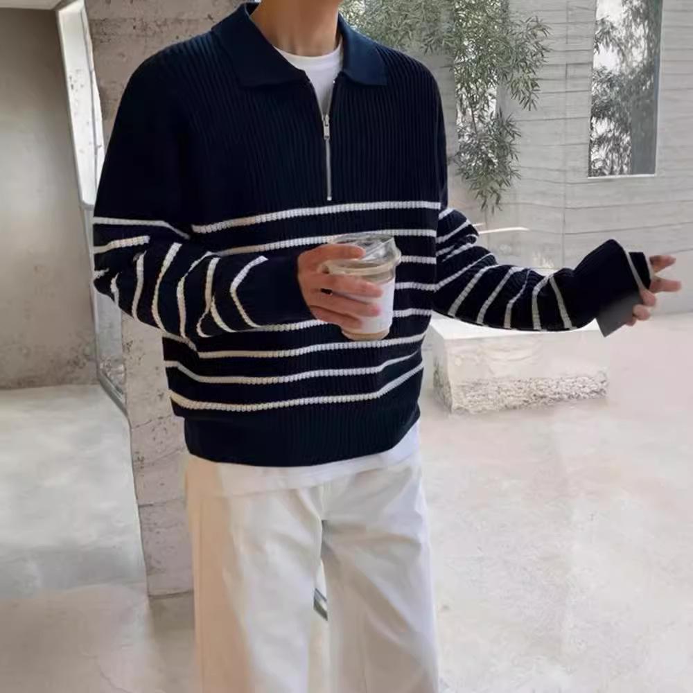 Men's Retro Korean Style Striped Half-Zip Sweater with Lapel