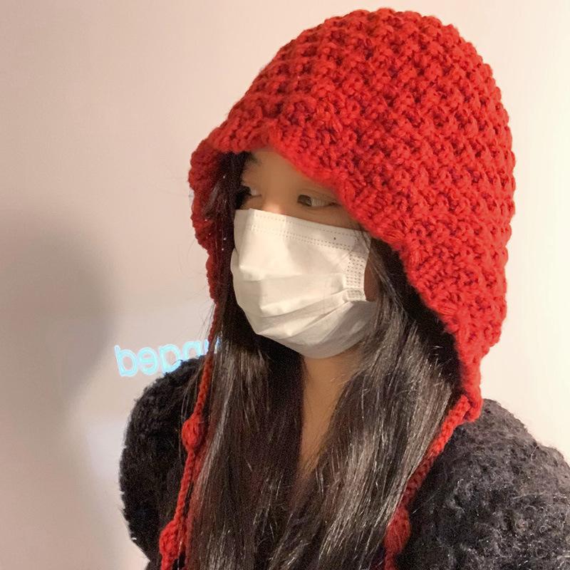 Handmade Fringed Ball Red Knitted Wool Hat Thermal Bald Hat Winter Ear Protector Tied Hat Trendy Hat Children
