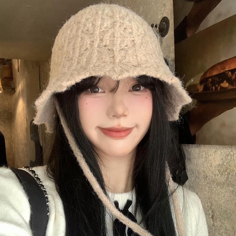 Strap Knitted Bucket Hat Women's Autumn and Winter New Versatile Bucket Hat Big Head Circumference Show Face Small Wool Hat