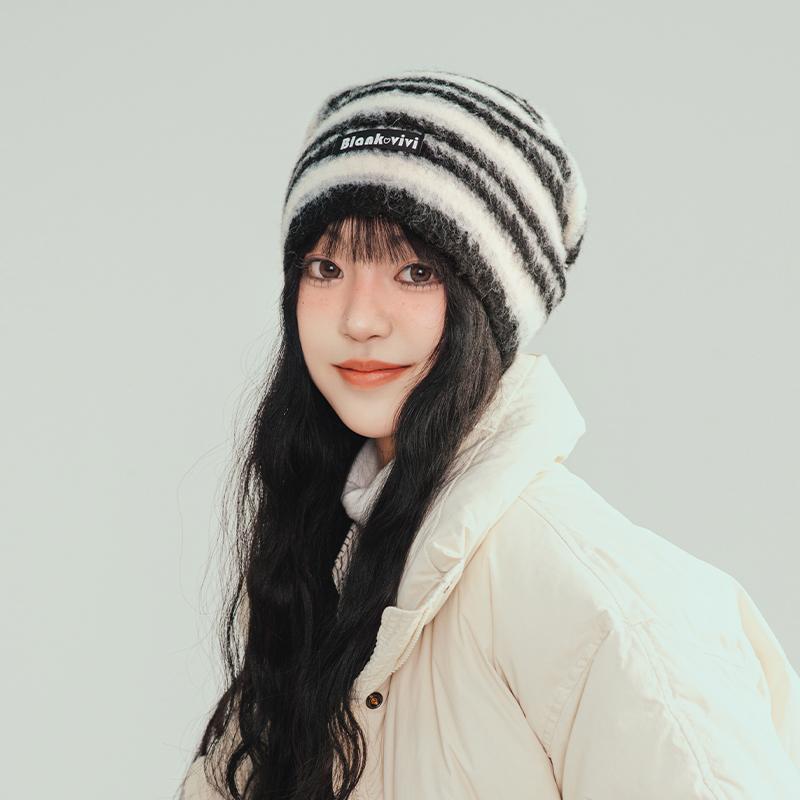 Retro Striped Plush Pile Hat Women's Autumn and Winter Warm Big Head Circumference Loose Cold Hat Showing Face Small Knitted Wool Hat