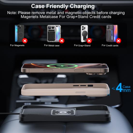 For perfect use, remember to remove any metal items such as credit cards or magnetic holders that may interfere with charging. Optimal placement on your dashboard or vents, compatible with most car stands, ensures convenient and efficient charging wherever you go. Stay powered up effortlessly with the wireless car charger – your ultimate co-driver on the road.