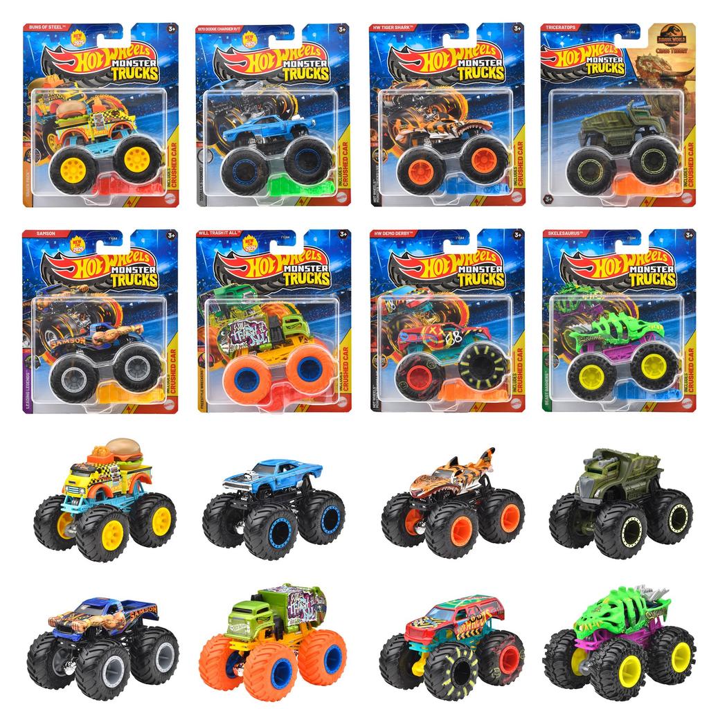 [Contents] A new assortment of 1/64 scale monster trucks featuring large tires is now available! A wide range of models, from original cars to full-scale models, is available! This assortment includes the hamburger and fries trucks "Buns of Steel," "Samson," and "Will Trash It All," all with new deco designs! Includes a car you can crash with the monster truck.