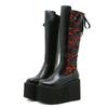 Gdgydh Women's Retro Floral Lace-Up Knee-High Winter Boots with Thick Wedge Heel Side Zipper Cowgirl Boots Semiformal Footwear