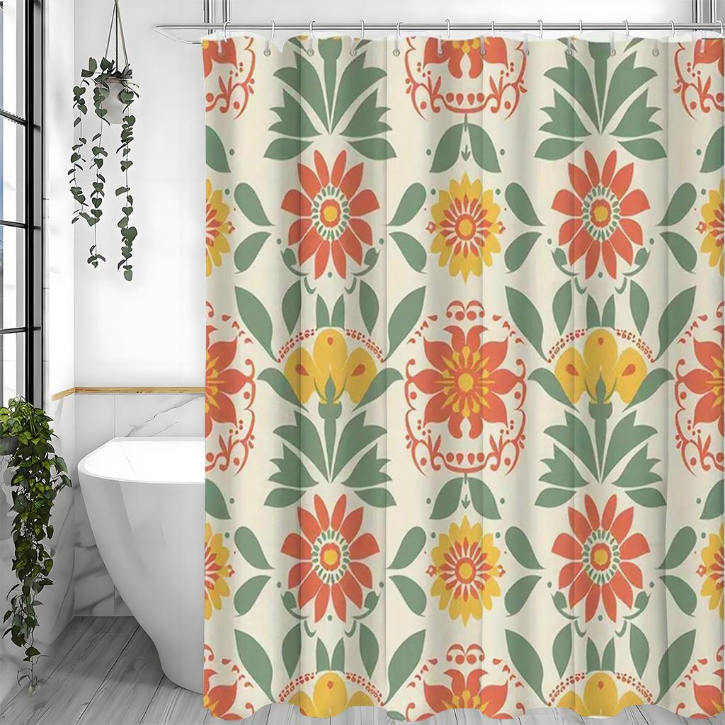 Bathroom Decor (Shower Curtain), Cartoon Flower & Green Leaf Shower Curtain with 12 Hooks