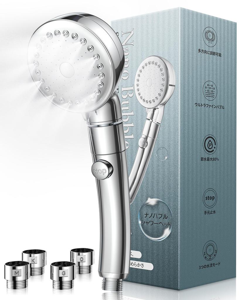 Anycee's nano bubble shower head has up to 300 million ultra-fine bubbles that penetrate deep into the pores and thoroughly remove sebum and makeup stains that are difficult to remove with a normal shower. It provides oxygen and moisture to the skin, preventing dryness and rough skin. It achieves a strong water flow even with low water pressure, and reduces utility bills with up to 80% water saving effect. You can easily switch between three modes: mist, straight, and mix. The unique 3D rotating head allows you to freely adjust the angle, making it easy to reach your back and feet. No tools are required for easy installation, and the K/M/G/O adapter is included to fit most Japanese household hoses. With a luxurious design, 2-year warranty, and Japanese support, it is also perfect as a gift.