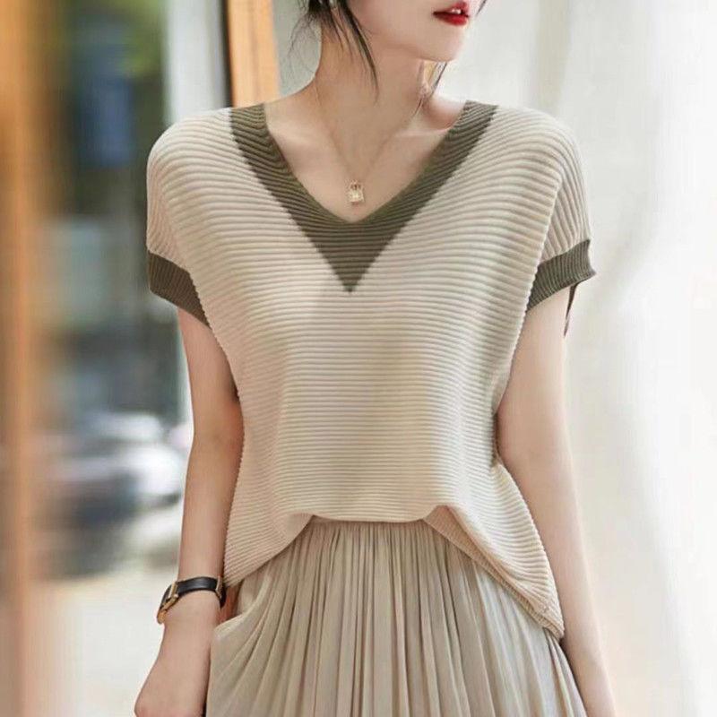 Fashion Striped Contrasting Colors Pullovers Loose Summer New Short Sleeve Female Korean Elegant V-Neck Spliced Knitted T-shirt