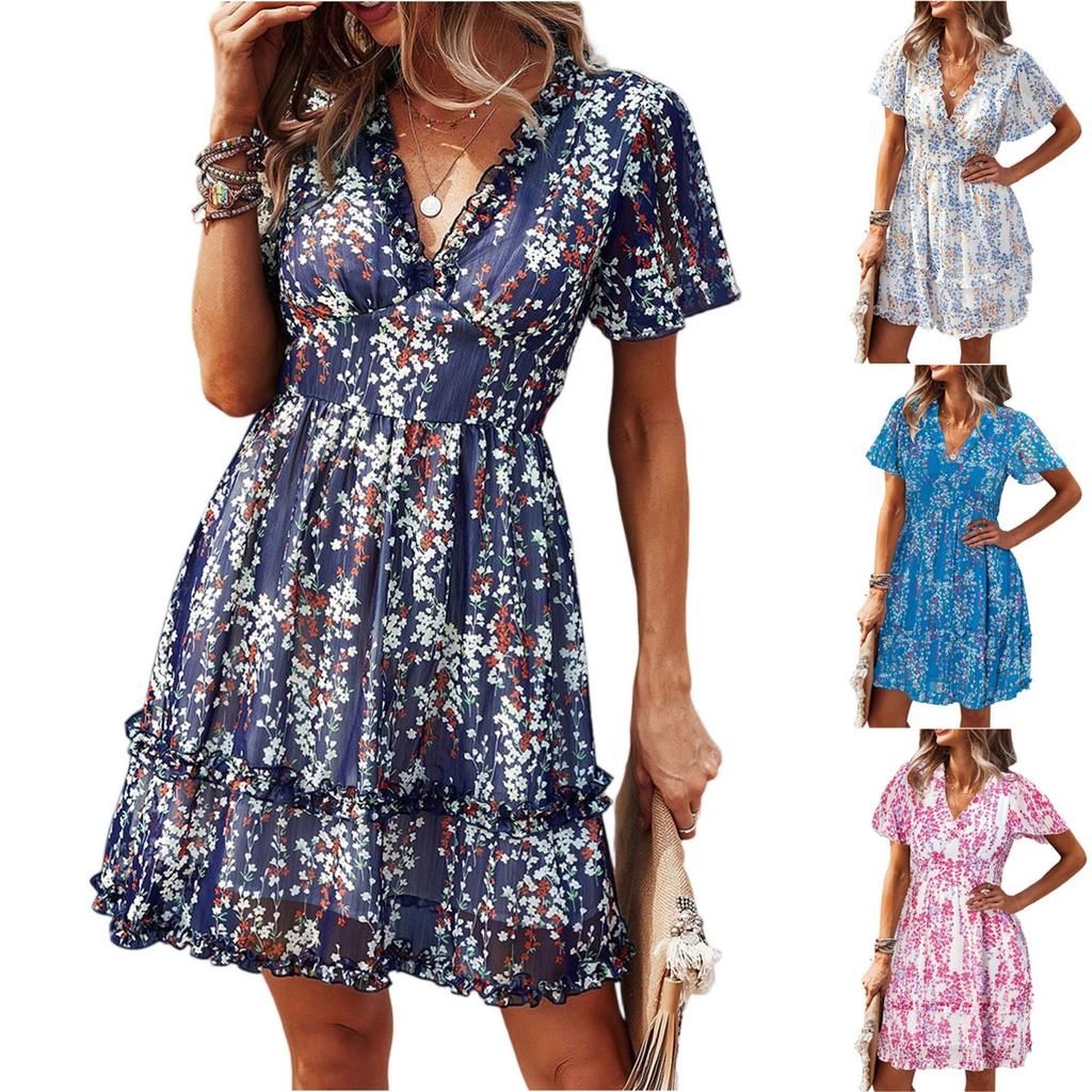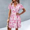 Women's Fashion Summer Floral Print V Neck Short Sleeved Casual Vacation Dress