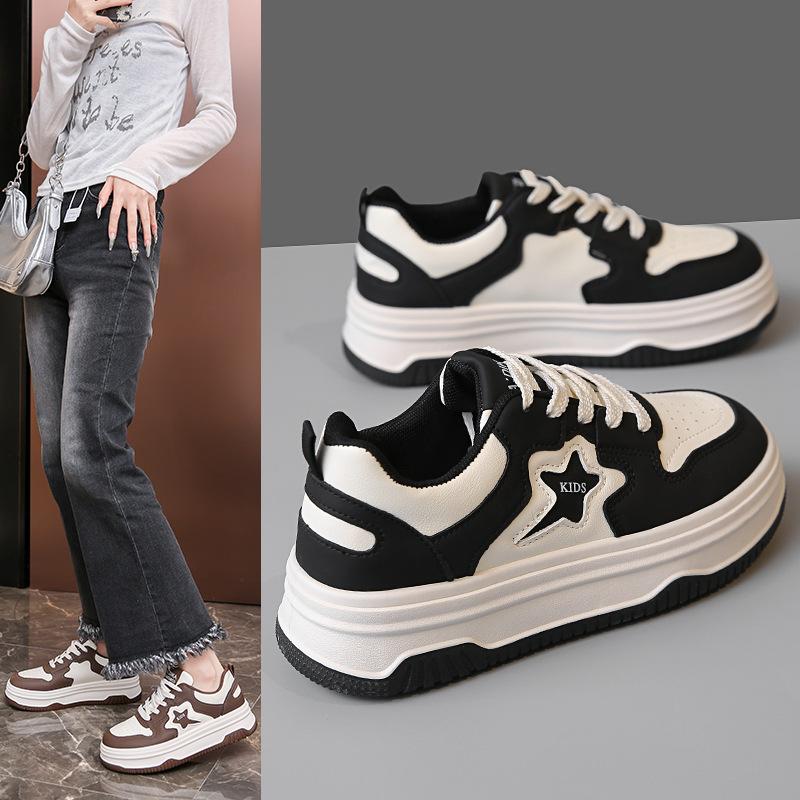 Little White Shoes Women's New Spring and Autumn Thick Baseplate Shoes Versatile Black and White Stars Panda Shoes Tide