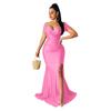 Elevate your wardrobe with this elegant evening dress, perfect for the spring and summer seasons. Designed with a sultry V-neck and a daring high slit, this piece offers a blend of sophistication and allure. The solid color exudes timeless charm, while the short sleeves provide a contemporary touch. Ideal for upscale events, this dress complements the modern woman's style, making you the center of attention at any gathering.