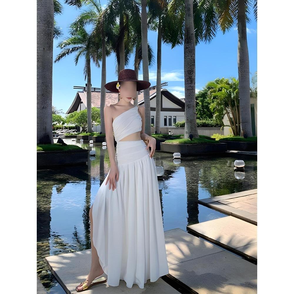Suitable for Seaside Photos, Beautiful White Slanted Shoulder Dress, Holiday Atmosphere, Tourist Beach Dress Summer