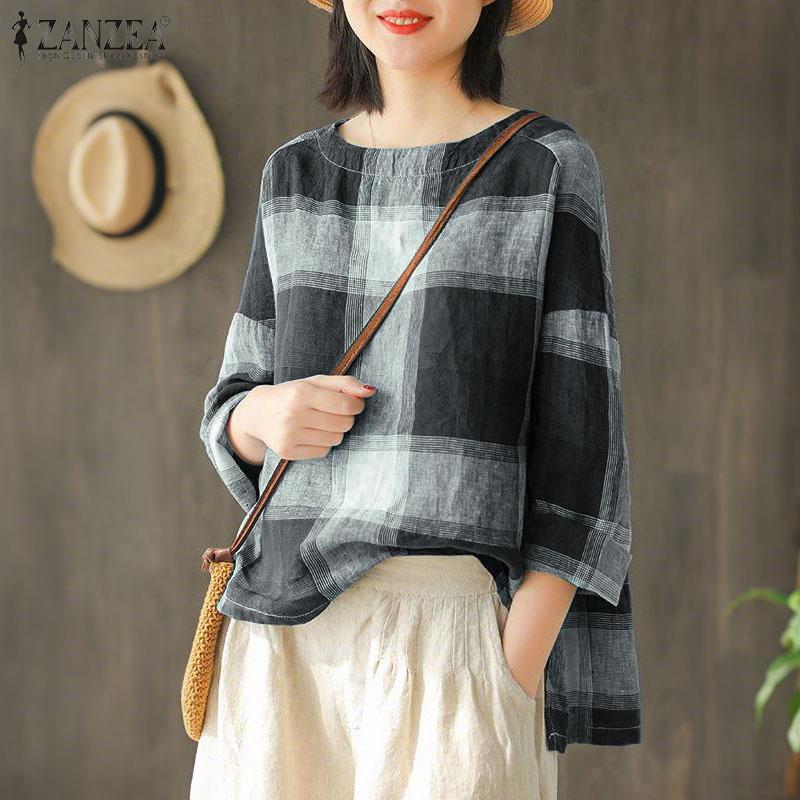 ZANZEA Women Casual Round Neck Plaid Print Long Sleeve Cover Up Tee Tops