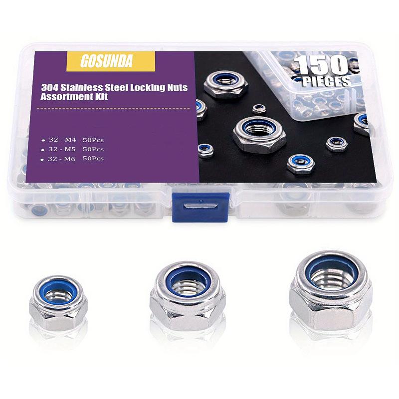 304 Stainless Steel Anti-loose Nut Set Anti-skid Self-locking Screw Cap 150Pcs Boxed Lock Nut M4M5M6