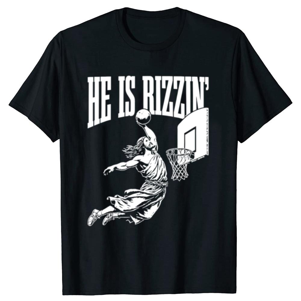 He Is Rizzin Funny Jesus Basketball Meme Graphic T Shirts Men Pure Cotton Streetwear Tee Shirt Short Sleeve Unisex Clothing