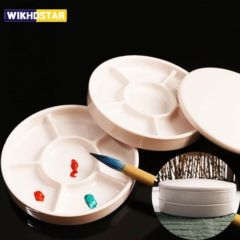 Imitation Porcelain Round Palette with Lid Acrylic Watercolor Painting Multifunctional White Paint Tray Artist Supplies