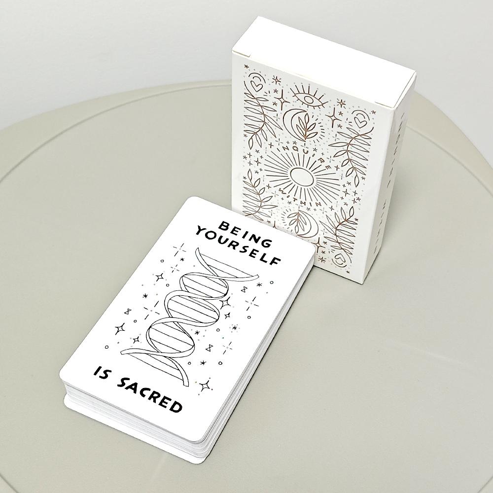 + Explore: flip through the deck and find a card with a message that speaks to you at the moment. Put it up in your space to remind you.