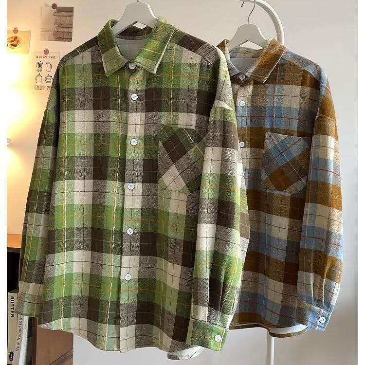 Spring and Autumn Japanese Long-sleeved Plaid Shirt Men's Loose Korean Casual Shirt Jacket