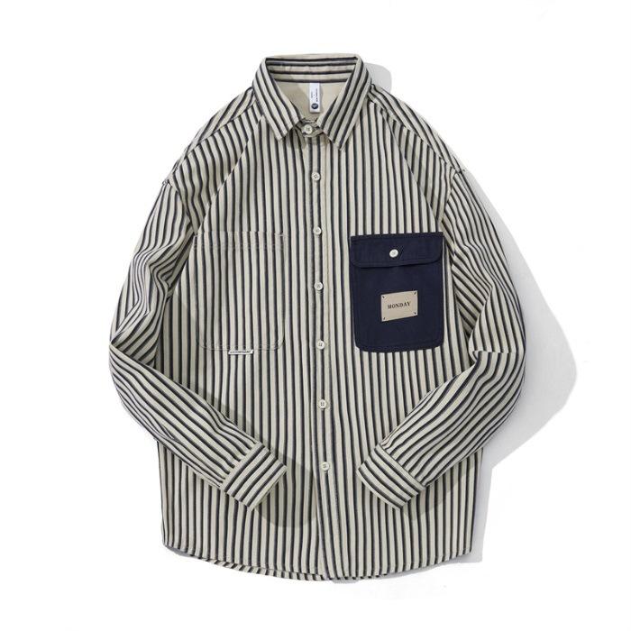 New Spring Retro Pure Cotton Striped Long-sleeved Shirt for Men's Outer Shirt