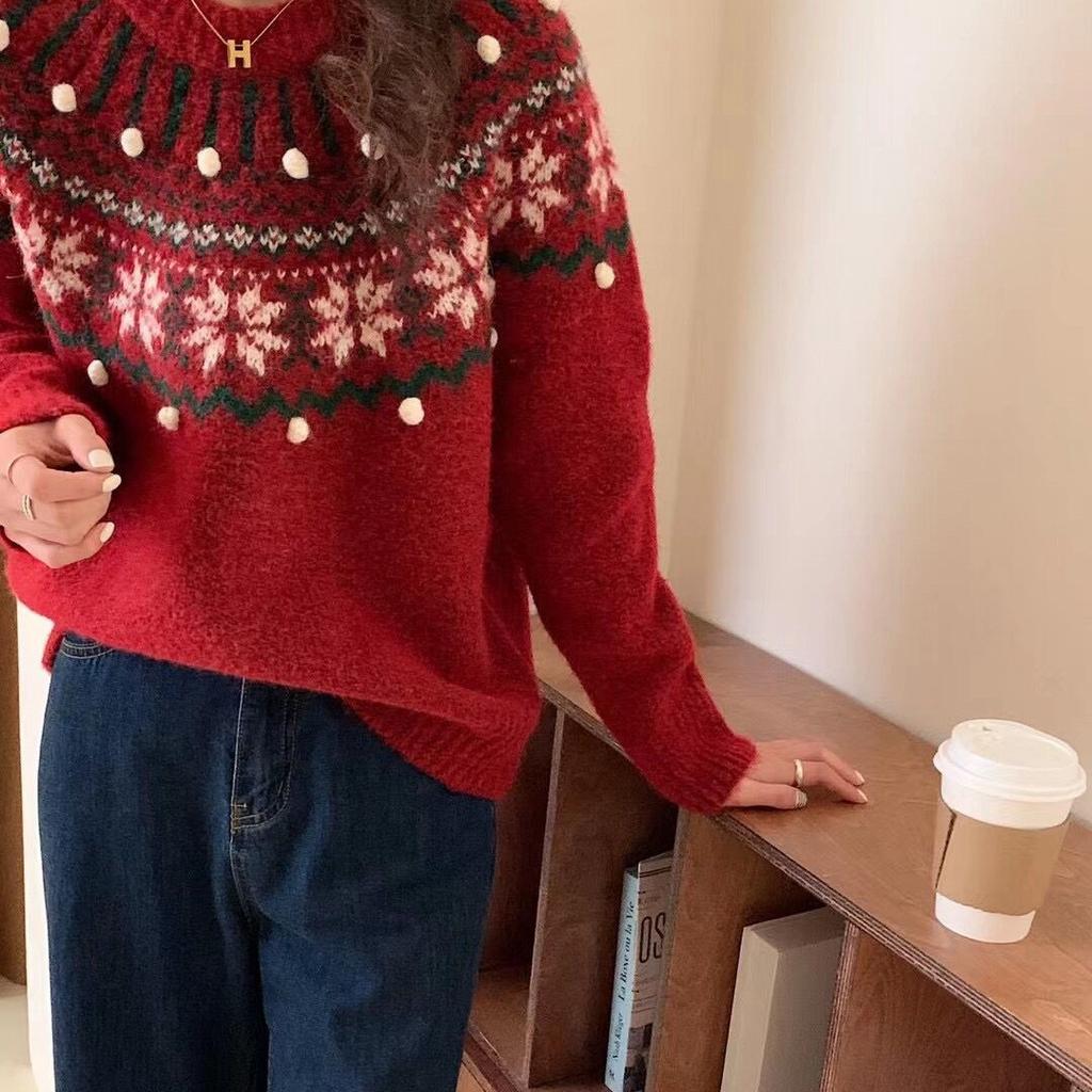 Autumn and Winter Christmas Lazy Soft Waxy Crew Neck Knitted Sweater Retro Jacquard Red Fair Island Sweater Women's Pullover Loose