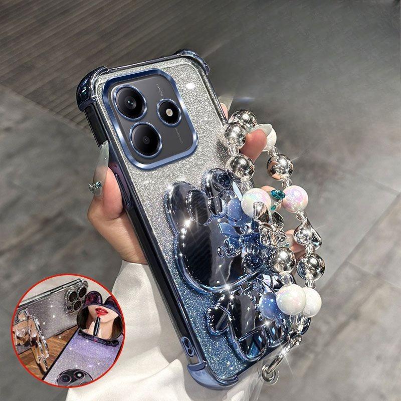 Rabbit Mirror Bracket Phone Case for Redmi Note 14 S Pro 13 Pro Plus 14C A5 with Bracelet Four Corner Airbag Cushioning Shell