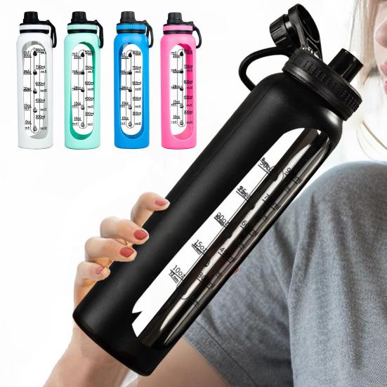 Glass Water Bottle with Silicone Sleeve Time Marker 1000ml Leakproof Borosilicate Water Cup for Sports Fitness Office
