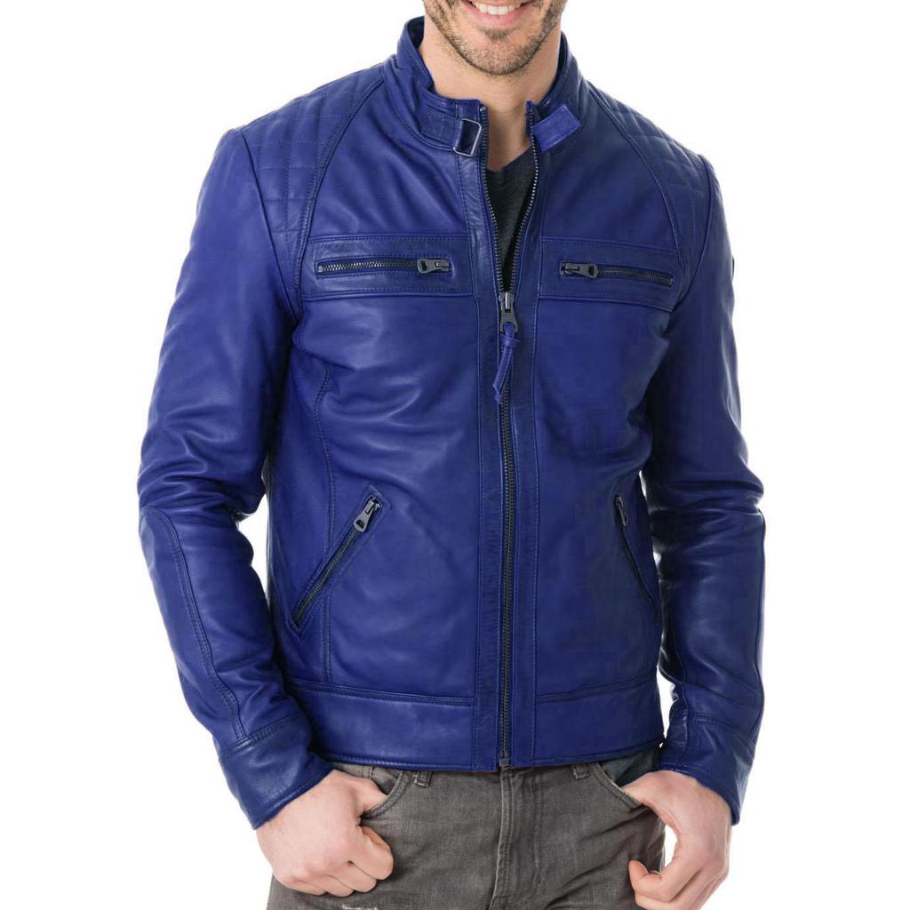 SKINOUTFIT Men's Genuine Lambskin Blue Leather Jacket Stylish Motorcycle Bomber Biker Outerwear MJ 216