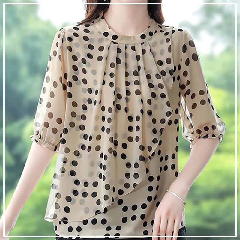 Summer Elegant and Minimalist Commuting Fashion Round Neck Polka Dot Loose Oversize Versatile Mid Sleeved Shirt for Women