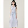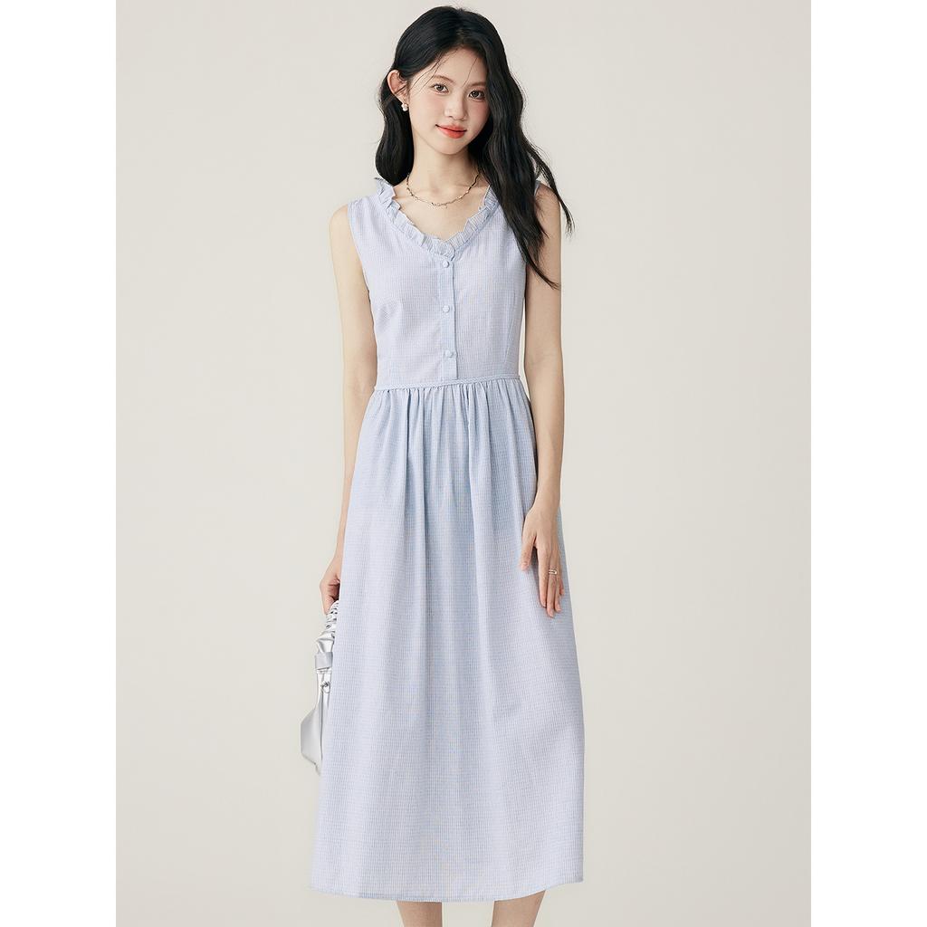 Summer Blue Plaid Edge Lace-up Sleeveless Vest Skirt Women's Medium and Long Dress