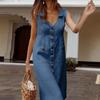 Women's Casual Summer Business Work V-Neck Sleeveless Button-Up Shirt Midi Dress With Pockets Dress