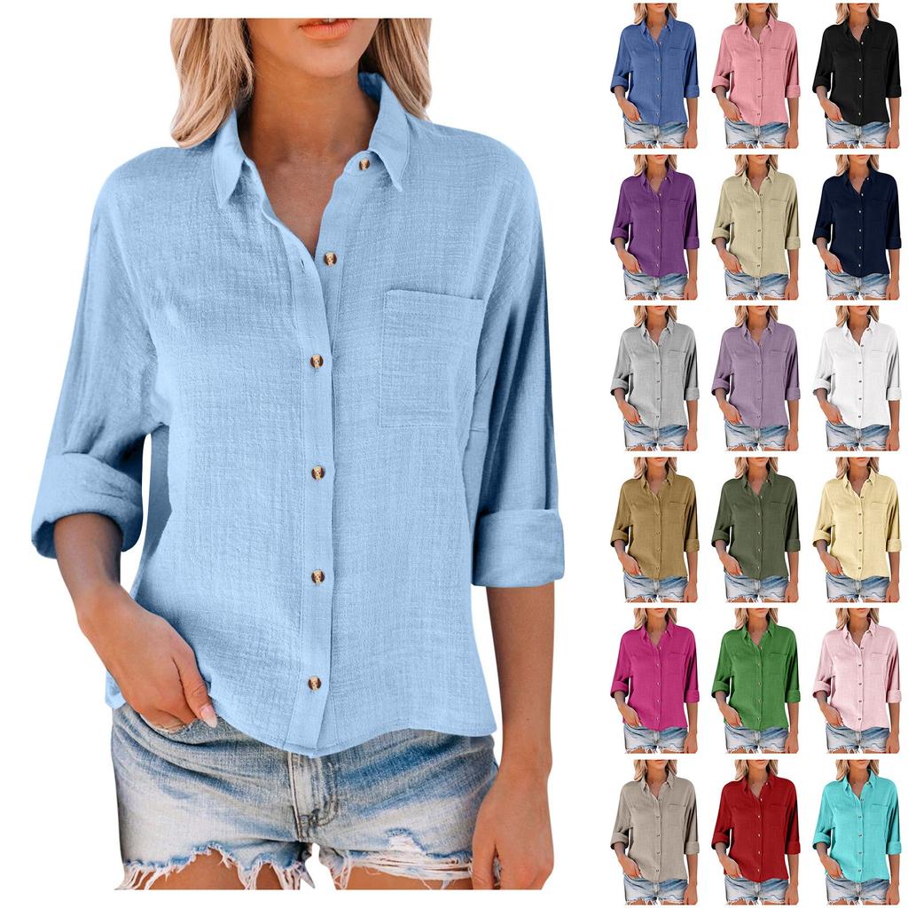 Women's Loose Cotton Linen Solid Color Long Sleeve Cardigan Irregular Pocket Shirt Top