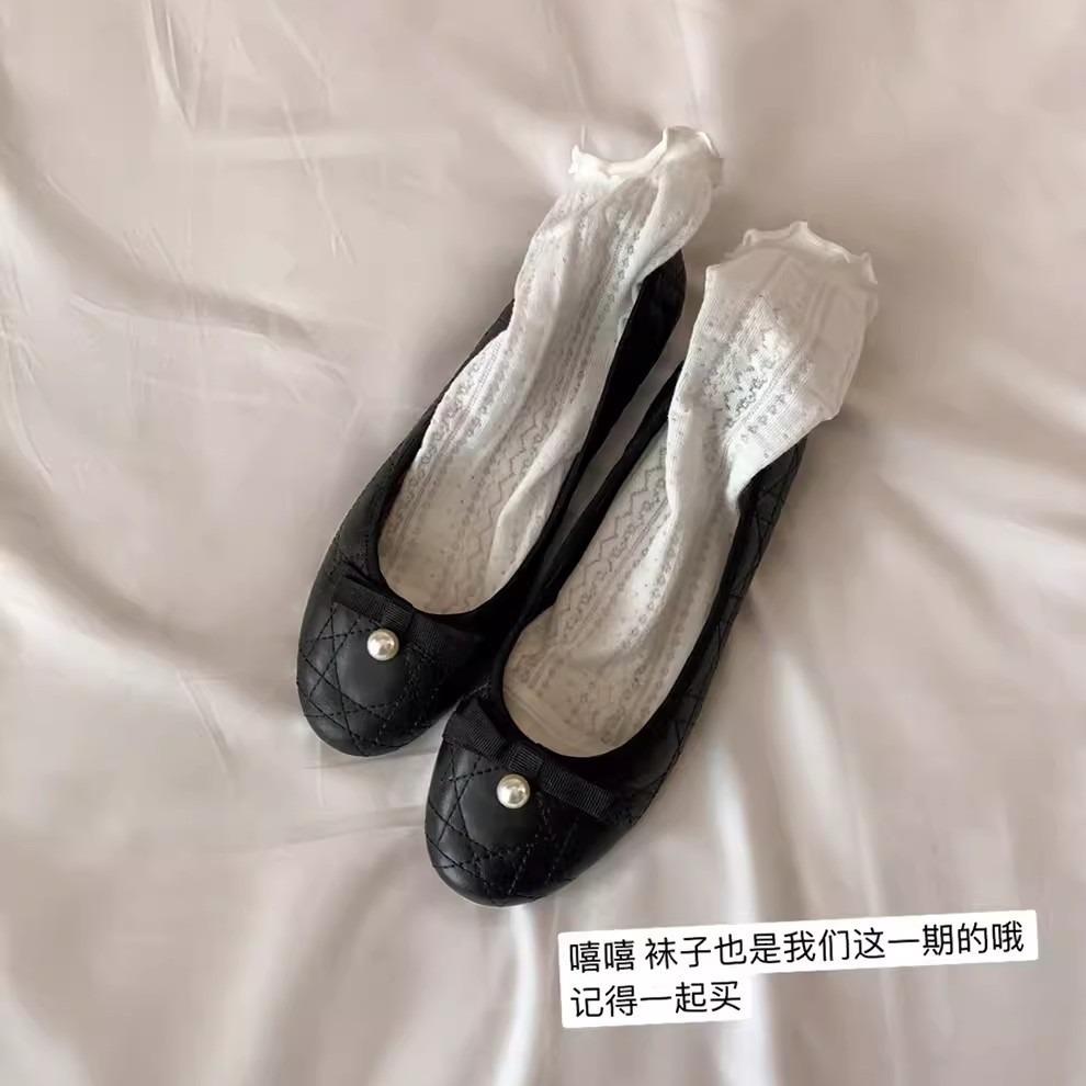 Superior Sheepskin Version~ Su Yinyin Pearl Bow Diamond Flat Leather Single Shoes Women's Ballet Shoes