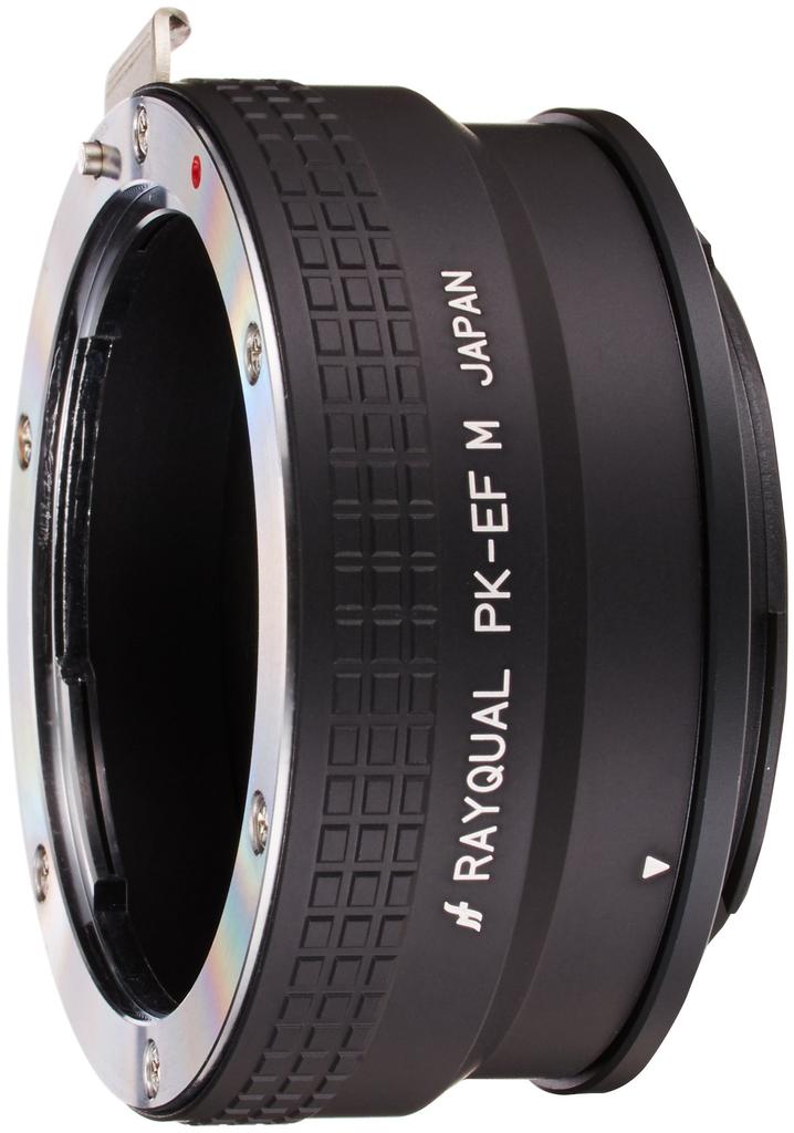 An adapter for attaching Pentax K mount lenses to Canon EOS M mount cameras.