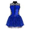 Girls Race Car Driver Costume Sequins Patchwork Mock Neck Sleeveless Front Zipper Rhinestone Waist Ring Puffy Dress
