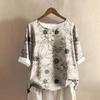 Women's Casual Mid-sleeve Round Neck Retro Floral Print Cotton And Linen Top