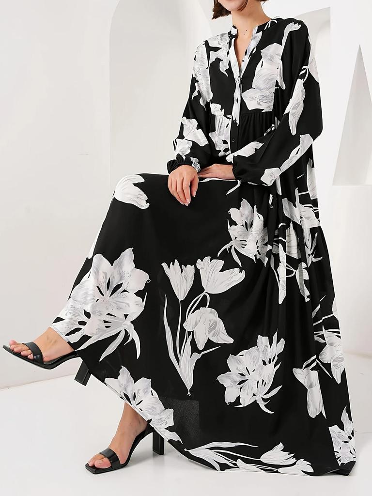 Elegant Noble Floral Print Black Robe - Arab Muslim Middle Eastern French Long Dress