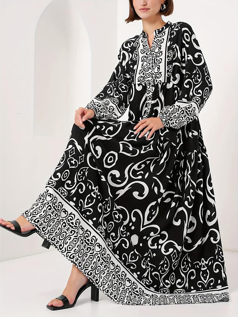 Elegant Long Sleeve V-Neck Arabic Black Dress with Islamic Print