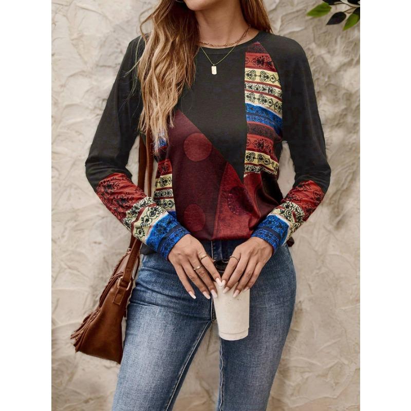 Elegant Women's T-shirt 3D Retro Printing Fashion Long Sleeve Round Neck Regular Top Holiday Weekend Spring and Autumn