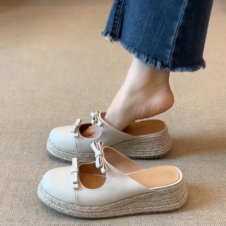 French Straw Thick-soled Bag Head Bow Cool Slippers Women's Summer 2025 New Versatile Skirt Half Slippers
